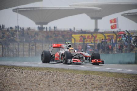Al via la pista è bagnata, Hamilton guadagna quattro posizioni mentre il compagno rimane coinvolto nell'incidente tra Alonso e Schumacher e perde due posizioni. Dopo sette giri la McLaren richiama i suoi piloti per montare gomme da asciutto; Button scivola in diciannovesima posizione; al giro successivo rientra Hamilton che ritorna in pista undicesimo. Dopo pochi giri ed i pit stop degli altri piloti, Button è secondo dietro Vettel ed Hamilton dopo il sorpasso a Barrichello è settimo. Al sedicesimo giro Hamilton passa Webber e Massa ma quest'ultimo si riprende la posizione; al ventiduesimo passaggio il pilota inglese, nel sorpasso a Massa, danneggia leggermente l'alettone anteriore ma riesce a proseguire. Dopo quattro giri Vettel va fuori pista e Button si ritrova al comando della gara che conserva fino alla bandiera a scacchi; Hamilton passa Rosberg. Al trentacinquesimo giro Hamilton effettua il secondo pit stop che lo fa scivolare in quinta posizione, con le gomme nuove inanella una serie di passaggi veloci e si porta alle spalle delle due Ferrari; al penultimo giro però, viene tamponato da Webber che lo seguiva, va fuori pista e perde una posizione.